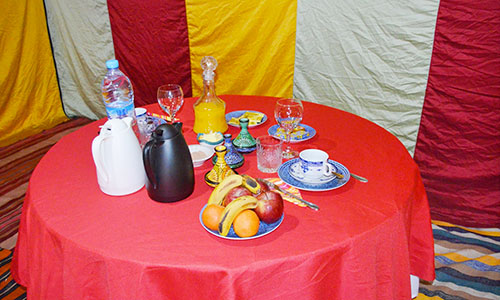 The camp’s restaurant offers a variety of Moroccan delicious food, extremely refined with something for everyone. On our camps, you will savor the delights of our gastronomy when you taste tajines, couscous, harira and a wide range of other Berber dishes during the tour days. Supplies of fresh fruits and vegetables are available, as well as Moroccan pastries which are stuffed with almond paste and fresh bread is baked every day. Each of our trips is accompanied by a trained Berber cook who prepares excellent three hearty meals each day. All meals are always prepared and cooked to meet the highest standards of hygiene. Menus can be custom-designed around your favorites and the daily menus can also be customized to meet the needs of each individual group.
